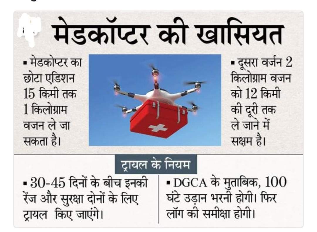 कंडासामी ने कहा कि मेडकोप्टर का छोटा एडिशन 15 किमी तक 1 किलोग्राम वजन ले जा सकता है, जबकि दूसरा 2 किग्रा वजन को 12 किमी तक ले जा सकता है। उन्होंने कहा कि हम 30-45 दिनों के दौरान रेंज और सुरक्षा दोनों के लिए ट्रायल करेंगे। इस दौरान हमें DGCA के अनुसार कम से कम 100 घंटे उड़ान भरनी होगी। हमारा लक्ष्य करीब 125 घंटे उड़ान भरने का है। ट्रायल के बाद लॉग को समीक्षा के लिए DGCA को सौंपा जाएगा।