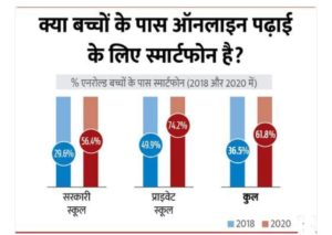 असर की रिपोर्ट कहती है कि 2018 के मुकाबले 2020 में ज्यादा परिवारों के पास अब स्मार्टफोन हैं। 2018 में सरकारी स्कूल में पढ़ने वाले 29.6% बच्चों के परिवारों में कम से कम एक स्मार्टफोन था, जो 2020 में बढ़कर 56.4% हो गया। इसी तरह प्राइवेट स्कूलों में पढ़ने वाले आधे बच्चों के परिवार में स्मार्टफोन था, जो अब बढ़कर तीन-चौथाई हो गया है।