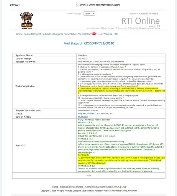 भारत बायोटेक ने कोवैक्सिन बनाने में नवजात बछड़े के सीरम का इस्तेमाल किया है। विकास पाटनी ने सूचना के अधिकार के तहत सेंट्रल ड्रग्स स्टैंडर्ड कंट्रोल ऑर्गेनाइजेशन (CDSCO) से यह जानकारी हासिल की। इसको लेकर सब जगह इतना बखेड़ा खड़ा हो गया कि सरकार और भारत बायोटेक, दोनों को सफाई देनी पड़ी।