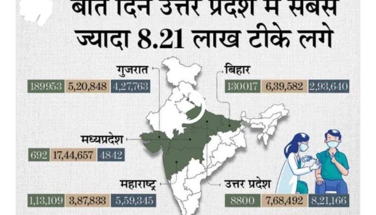 राज्य में मंगलवार को 8.21 लाख टीके लगाए गए। इनमें 18-44 साल के लोगों को 5.35 लाख, 45 से 60 साल के लोगों को 1.93 लाख और 60 साल से ऊपर के लोगों को 92,062 डोज लगाई गई। इससे पहले राज्य में रविवार को 8800 और सोमवार को 7.68 लाख टीके लगाए गए थे।