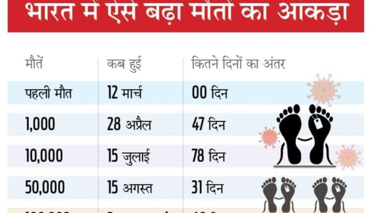 कोरोना के चलते 2 अक्टूबर को भारत में मौतों का आंकड़ा 1 लाख को पार कर गया। अमेरिका और ब्राजील के बाद अब भारत कोरोना से होने वाली मौतों के मामले में दुनिया में तीसरे नंबर पर है। भारत में कोरोना से होने वाली पहली मौत के 204 दिनों के बाद यह संख्या 1 लाख मौतों तक पहुंची है। वहीं, ब्राजील में यह आंकड़ा 158 दिनों में ही पहुंच चुका था, जबकि अमेरिका में शुरुआती 1 लाख मौतें 83 दिनों में हुई थीं।