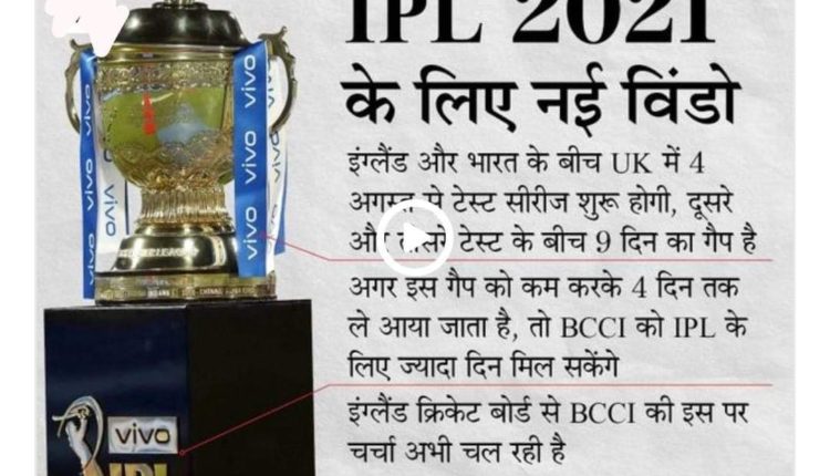 सूत्रों के मुताबिक इंग्लैंड और भारत के बीच UK में 4 अगस्त से 5 टेस्ट मैचों की सीरीज शुरू होगी। दूसरे और तीसरे टेस्ट के बीच 9 दिन का गैप है। अगर इस गैप को कम करके 4 दिन तक ले आया जाता है, तो बोर्ड को IPL के मैच करवाने के लिए ज्यादा दिन मिल सकेंगे। इंग्लैंड क्रिकेट बोर्ड से BCCI की इस पर चर्चा अभी चल रही है।