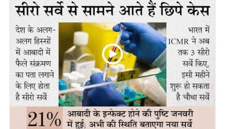 ICMR ने देश में पहला सीरो सर्वे मई 2020 में किया था। इसके बाद 2 और सीरो सर्वे किए गए। अंतिम सीरो सर्वे 17 दिसंबर 2020 से 8 जनवरी 2021 के बीच हुआ था। इस सर्वे के नतीजों में पता लगा था कि देश की 21.5% आबादी कोरोना से संक्रमित हो चुकी है। अभी भी 80% लोगों में कोरोना संक्रमण फैलने का खतरा है।
