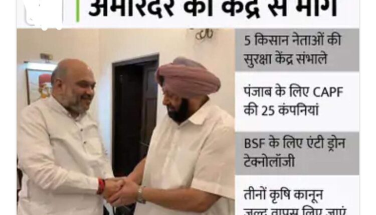 कैप्टन ने शाह को जो जानकारियां दीं, उनमें सबसे अहम कृषि कानूनों के खिलाफ चल रहे आंदोलन में शामिल किसान नेताओं की जान को खतरा है। उन्होंने 5 किसान नेताओं के बारे में बताया, जिनके खतरे के बारे में खुफिया एजेंसियों के पास सटीक इनपुट हैं। इनके नाम सार्वजनिक नहीं किए गए हैं।