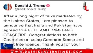 पाकिस्तान ने भी सीजफायर की पुष्टि की पाकिस्तान के विदेश मंत्री इशाक डार ने कहा, ‘पाकिस्तान और भारत ने तत्काल प्रभाव से युद्ध विराम पर सहमति जताई है। पाकिस्तान ने हमेशा अपनी संप्रभुता और क्षेत्रीय अखंडता से समझौता किए बिना क्षेत्र में शांति और सुरक्षा के लिए प्रयास किया है।’