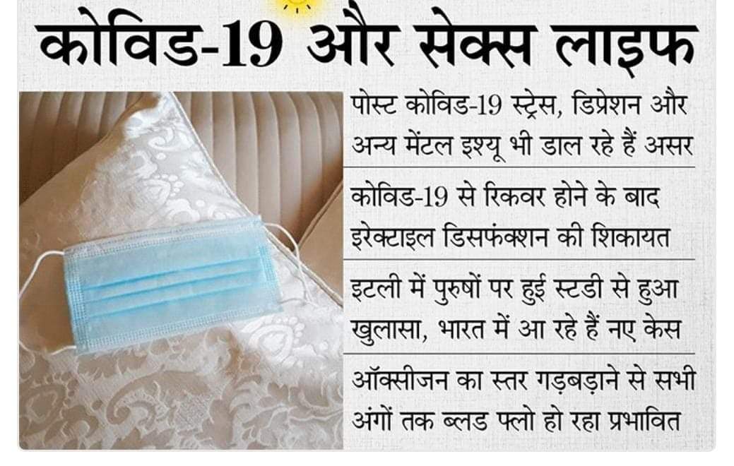 - वर्ल्ड जर्नल ऑफ मेन्स हेल्थ में प्रकाशित एक स्टडी का दावा है कि इन्फेक्शन के कई महीनों बाद भी पेनिस में इन्फेक्शन मिला है। दावा किया गया है कि कोविड-19 की वजह से शरीर के कई सेल्स के काम करने के तरीकों पर असर पड़ा है जो इरेक्टाइल डिसफंक्शन का कारण हो सकता है।