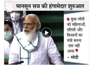 हंगामे पर मोदी ने कहा, ‘मैं सोच रहा था कि आज सदन में उत्साह का वातावरण होगा क्योंकि बहुत बड़ी संख्या में हमारी महिला सांसद, दलित भाई, आदिवासी, किसान परिवार से सांसदों को मंत्री परिषद में मौका मिला। उनका परिचय करने का आनंद होता, लेकिन शायद देश के दलित, महिला, ओबीसी, किसानों के बेटे मंत्री बनें ये बात कुछ लोगों को रास नहीं आती है। इसलिए उनका परिचय तक नहीं होने देते।’