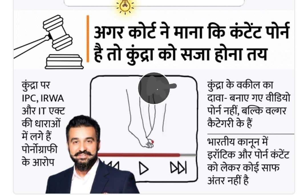 • दिल्ली के सीनियर एडवोकेट विकास पाहवा ने एक इंटरव्यू में कहा कि पोर्नोग्राफी की व्याख्या इंडियन पीनल कोड में नहीं है। कुंद्रा पर जो आरोप लगे हैं, वह मुख्य रूप से IT एक्ट के सेक्शन 67 और सेक्शन 67A के तहत हैं। अगर कोर्ट ने माना कि जो कंटेंट कुंद्रा बना रहे थे, वह पोर्न है तो उन्हें 5 से 7 साल तक की सजा हो सकती है।